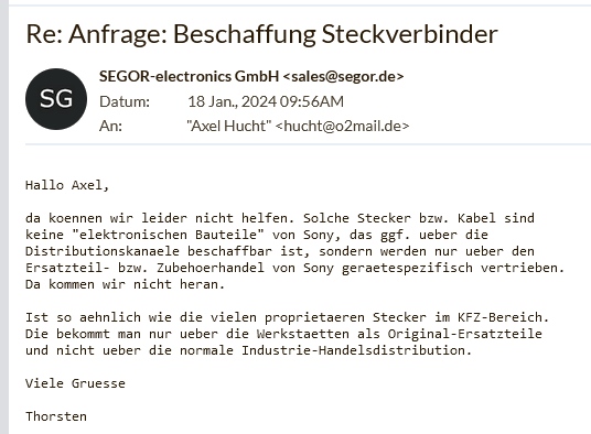 (14.01.2024, 22:01)prosony schrieb: ....Der Stecker ist übrigens nicht zu bekommen - es gibt ihn nur an diesem Gerät.