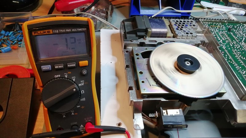 War ca. 300mV Soll ist +/- 100mV. Also die Kontermutter am Spindelmotor gelöst und die kleine Imbusschraube verstellt und wieder gemessen. Messen muß man im im Betieb mit einer I.O. CD. Jetzt habe ich je nach CD Werte im Betrieb zwischen -10 und +30mV.
