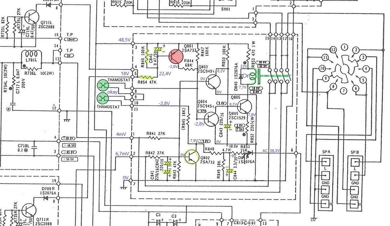 So soll es aber nicht sein  Was mir nun nicht klar ist: Wie funktioniert die Schutzschaltung um Q801 im Zusammenspiel mit den beiden Dioden D709 und den Transistoren Q711 in den Endstufen? Q801 dürfte nach meinem Verständnis doch gar nicht durchschalten, oder? Welche Spannungen / Ströme müssen hier anliegen und wie kann ich hier dem Fehler (oder meinem Gedankenfehler) auf die Spur kommen?