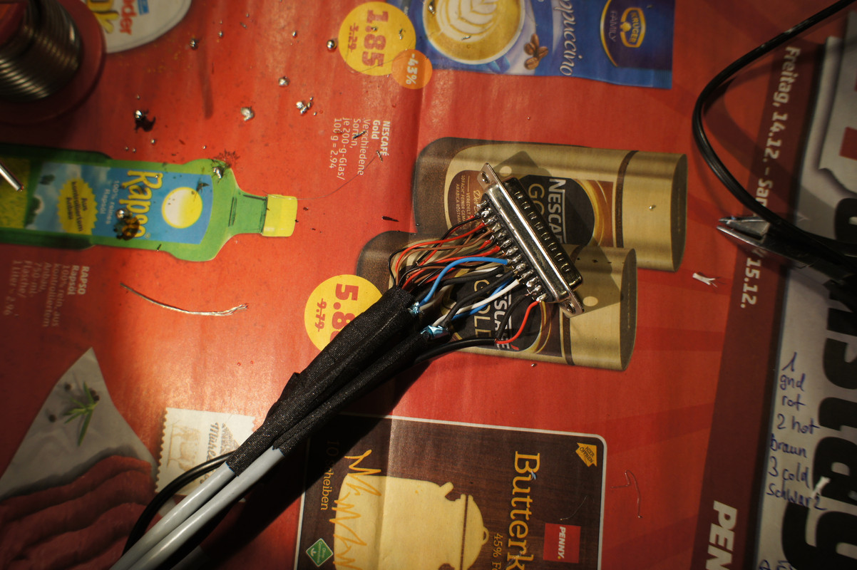 2x Digi In und 4Ch Analog In, Stromversorgung habe ich auch erst mal über den D-Sub gemacht. Sollte ich noch einen passenden Stecker für die originale Buchse finden, wird das noch geändert. Deswegen habe ich eine extra Buchse zur Stromversorgung genommen (liegt auf dem Butterkäse  ) . So konnte der originale Stecker vom zugekauften Netzteil dranbleiben.