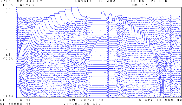 Stepped sweep (300Hz bis 20KHz, -20 dBFS) mit HP3561 und Testdisk.: Keine besonderen Auffälligkeiten im Audiobereich, Lediglich eine minimale Einkopplung der Video H-Freq. (um 15,6K)